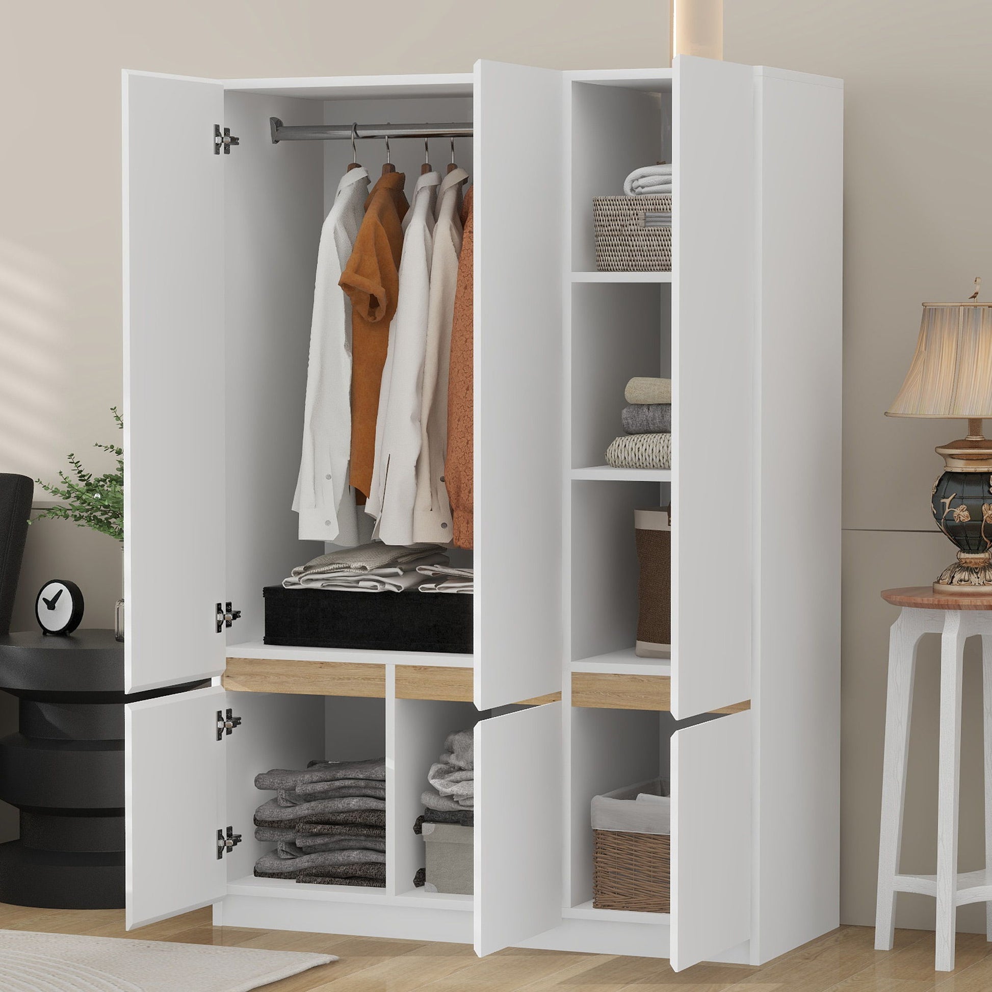 Weight Capacity: Each shelf, hanging rail, and drawer can support up to 15 kg, ensuring safe storage of clothes and other items with a well-thought-out design for your peace of mind.