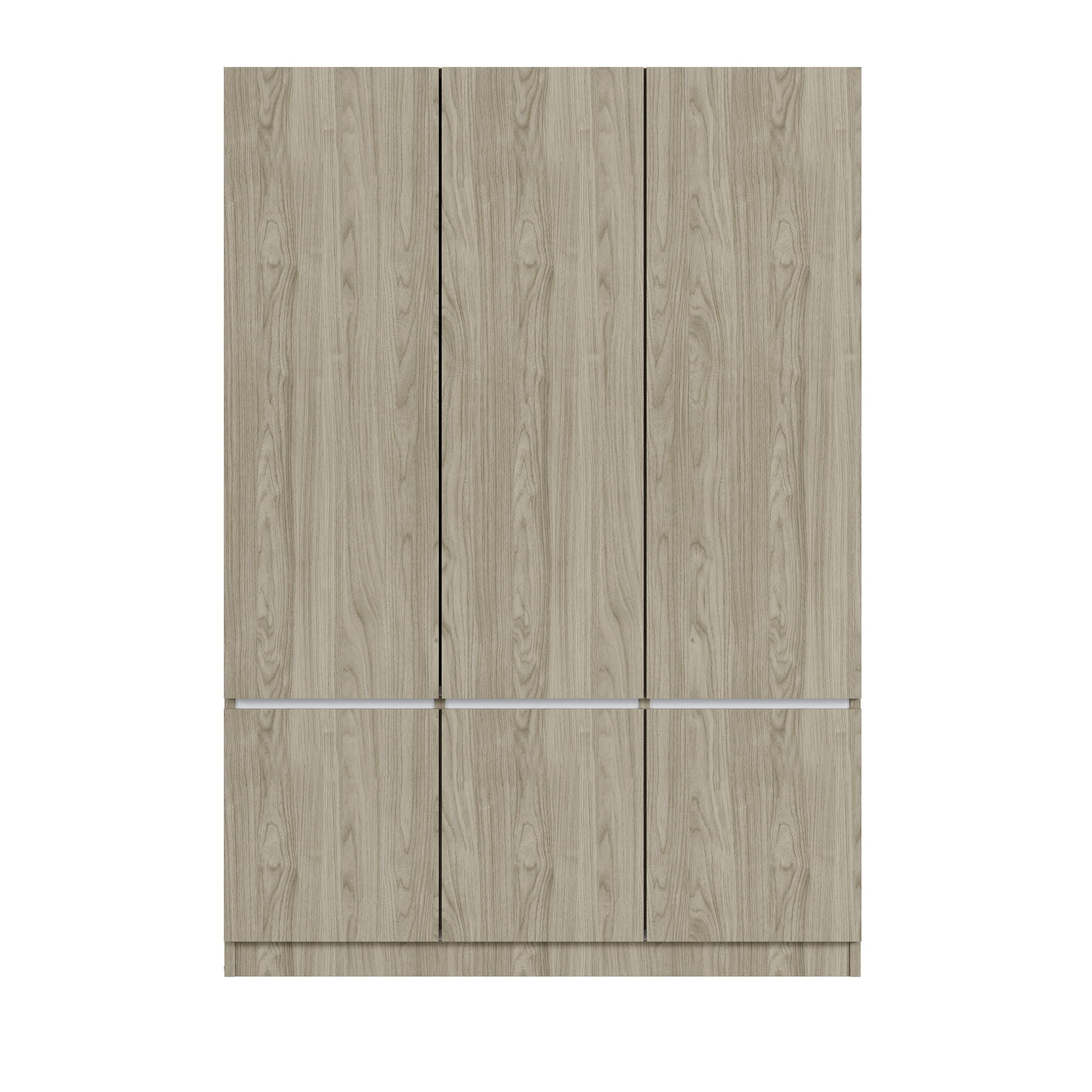 This modern six-door wardrobe is made from high-quality wood and MDF board, ensuring durability and stability. Its simple design features three large doors and three small doors, with a built-in hanging rail. The upper section includes three independent storage spaces, providing a total of seven storage compartments to meet various needs. Each shelf, hanging rail, and drawer can support up to 15 kg, ensuring safety and reliability.