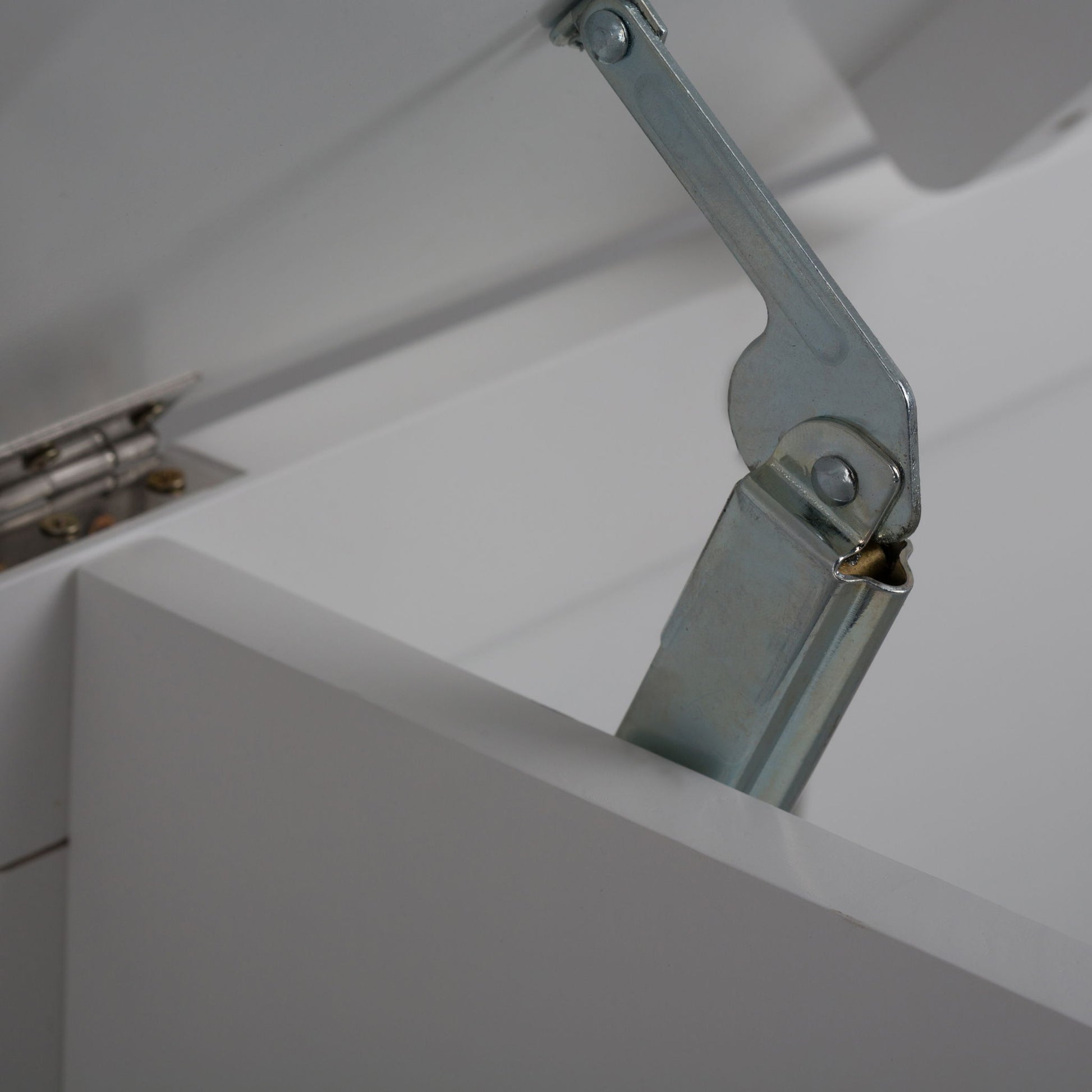 - Features lift up lid that opens using safety hinges to expose 2 large internal storage compartments