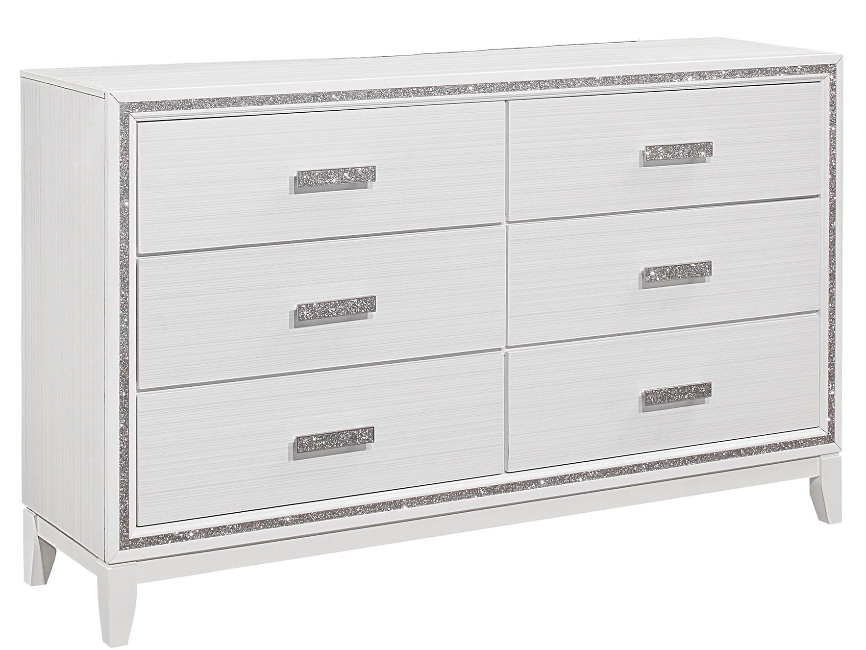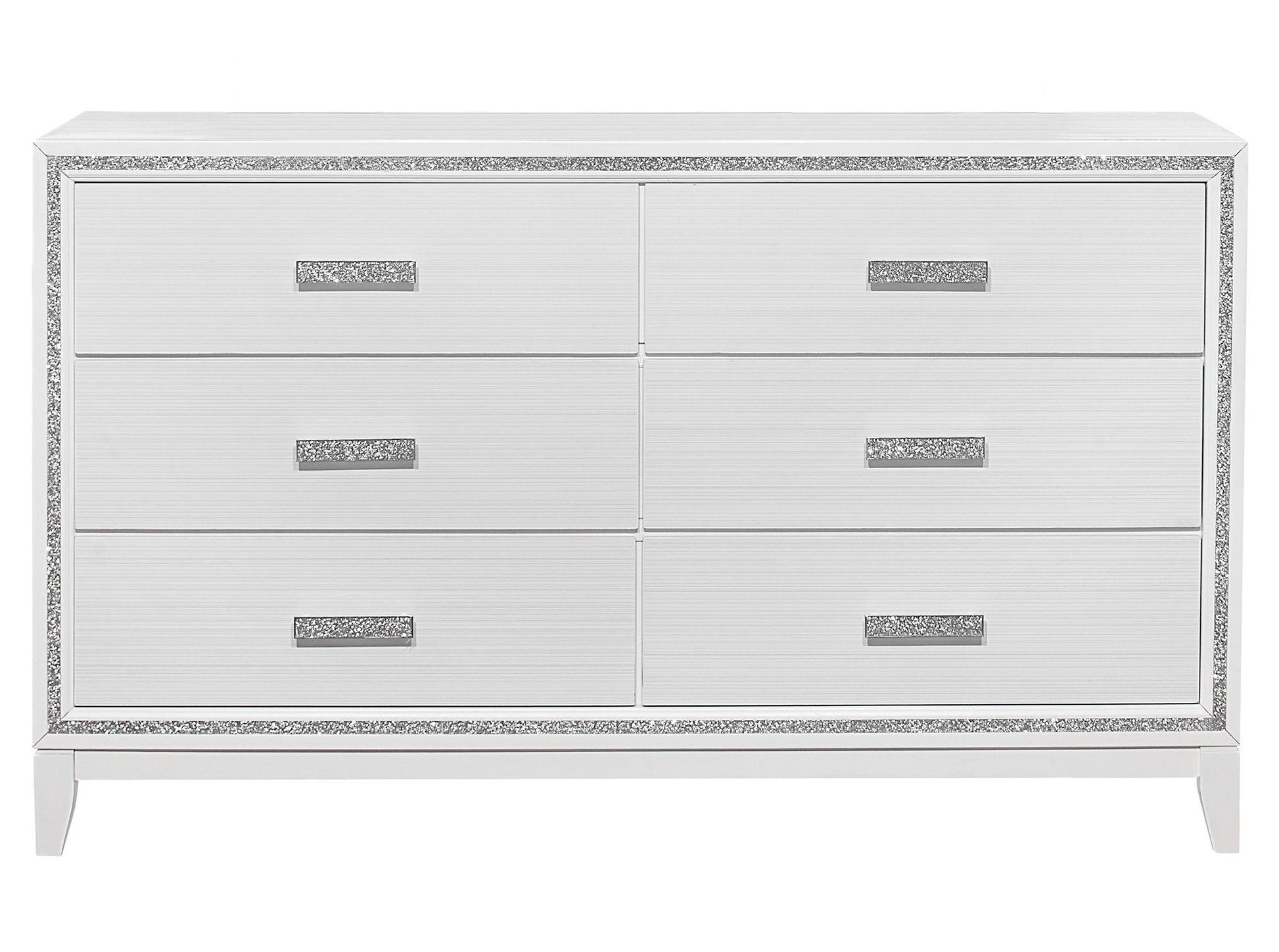 - Glamorous Design: The Almera Glitter White Dresser features a transitional glam style with a crushed crystal-like accent trim that adds a touch of elegance and sophistication to any bedroom decor.