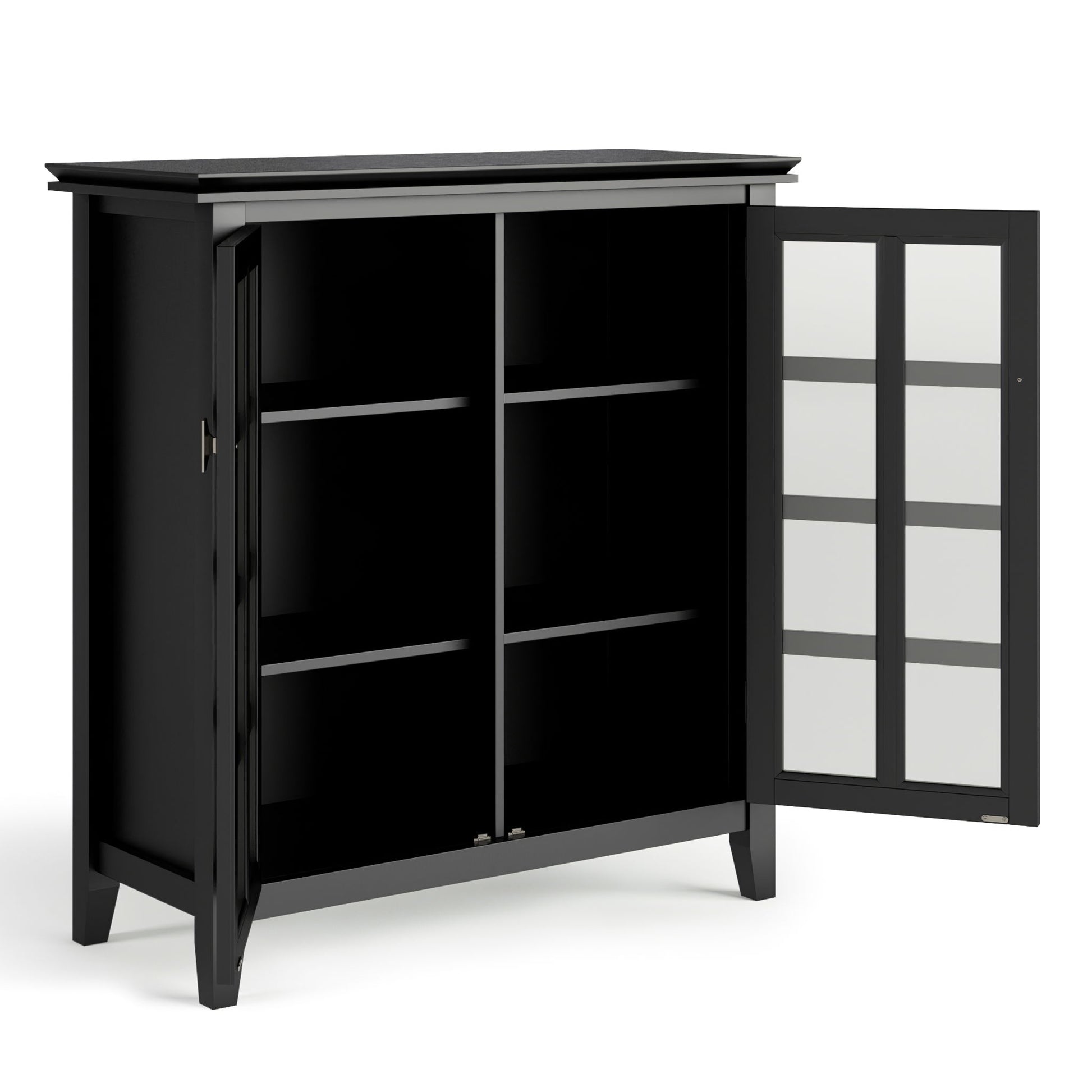 - Features 2 tempered glass doors that open to four adjustable shelves for versatile storage