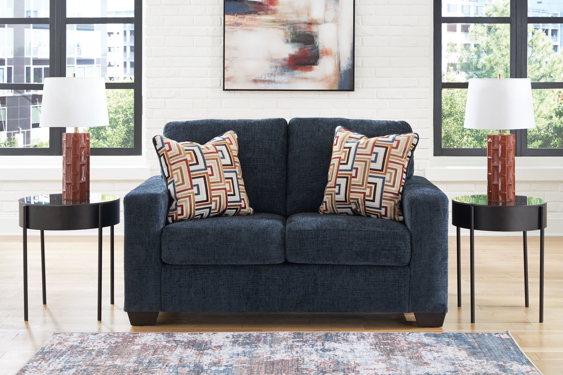 Looking to make a bold statement with color? Liven up your living room with this loveseat. Its trend-right upholstery adds a playful pop of color to your decor. Bold and eclectic accent pillows complete the look. Pairing posh style with everyday comfort, this piece is a welcome addition to contemporary spaces.