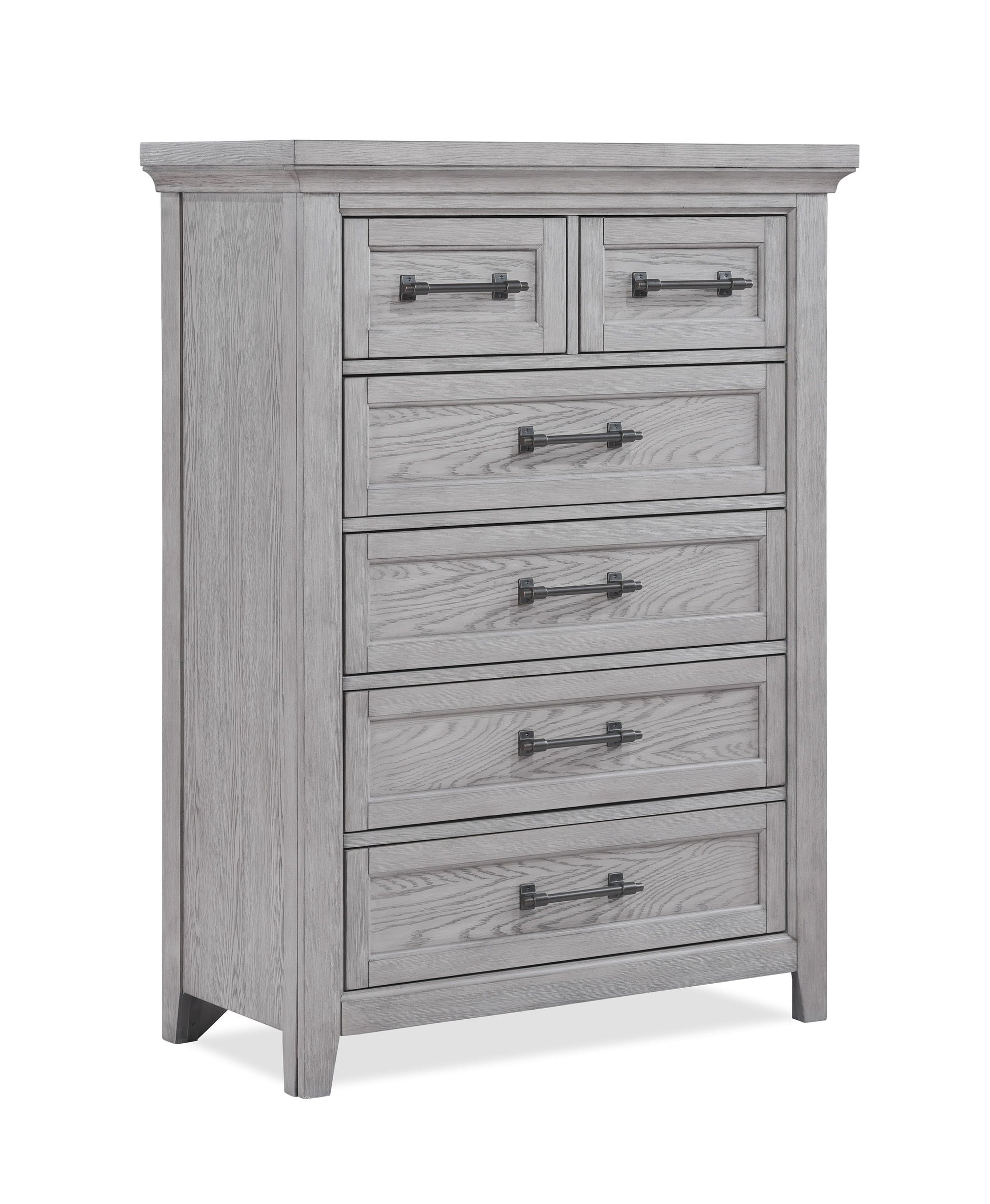 This bedroom suite offers a refreshing take on rustic charm, featuring a soft greige finish that highlights the natural wood grain. The sturdy bed stands as the centerpiece with its robust headboard and inviting design, while the accompanying pieces — a nightstand, dresser, and chest — provide ample storage, each fitted with understated hardware that accentuates the collection's country-inspired look.