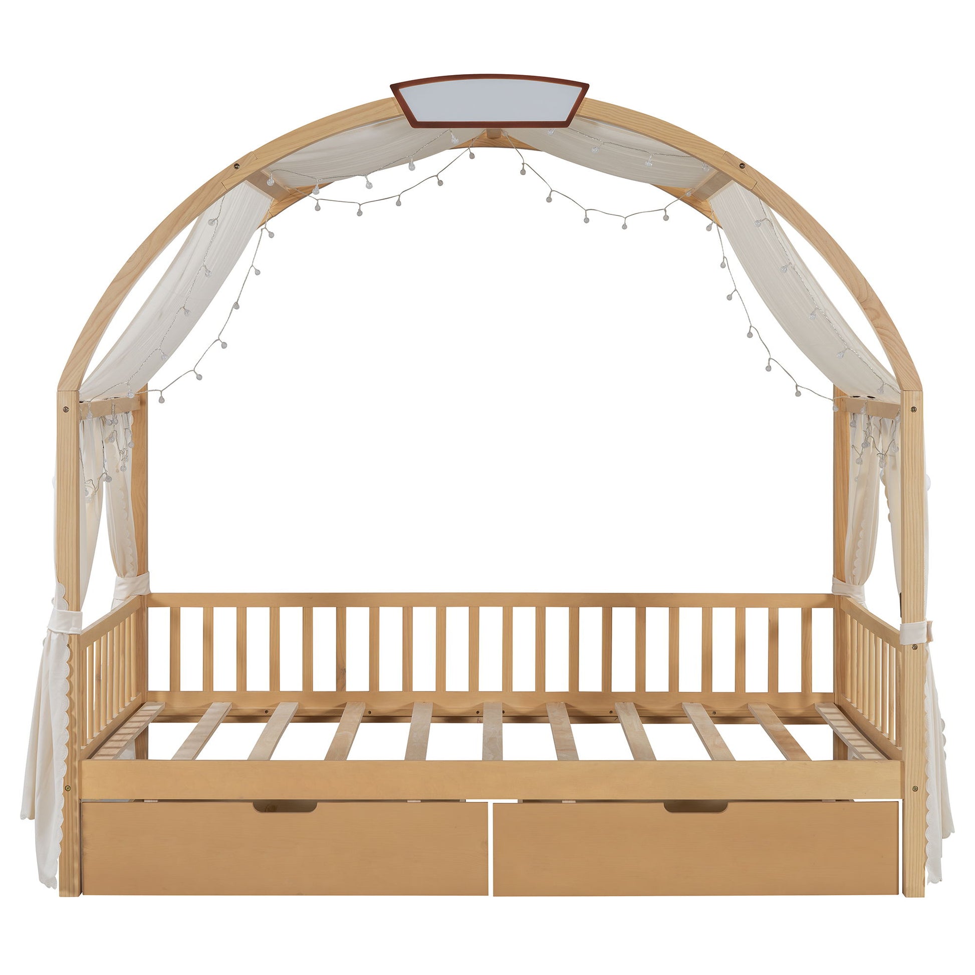 Twin Size Bed With Arched Roof And 2 Drawers - Natural