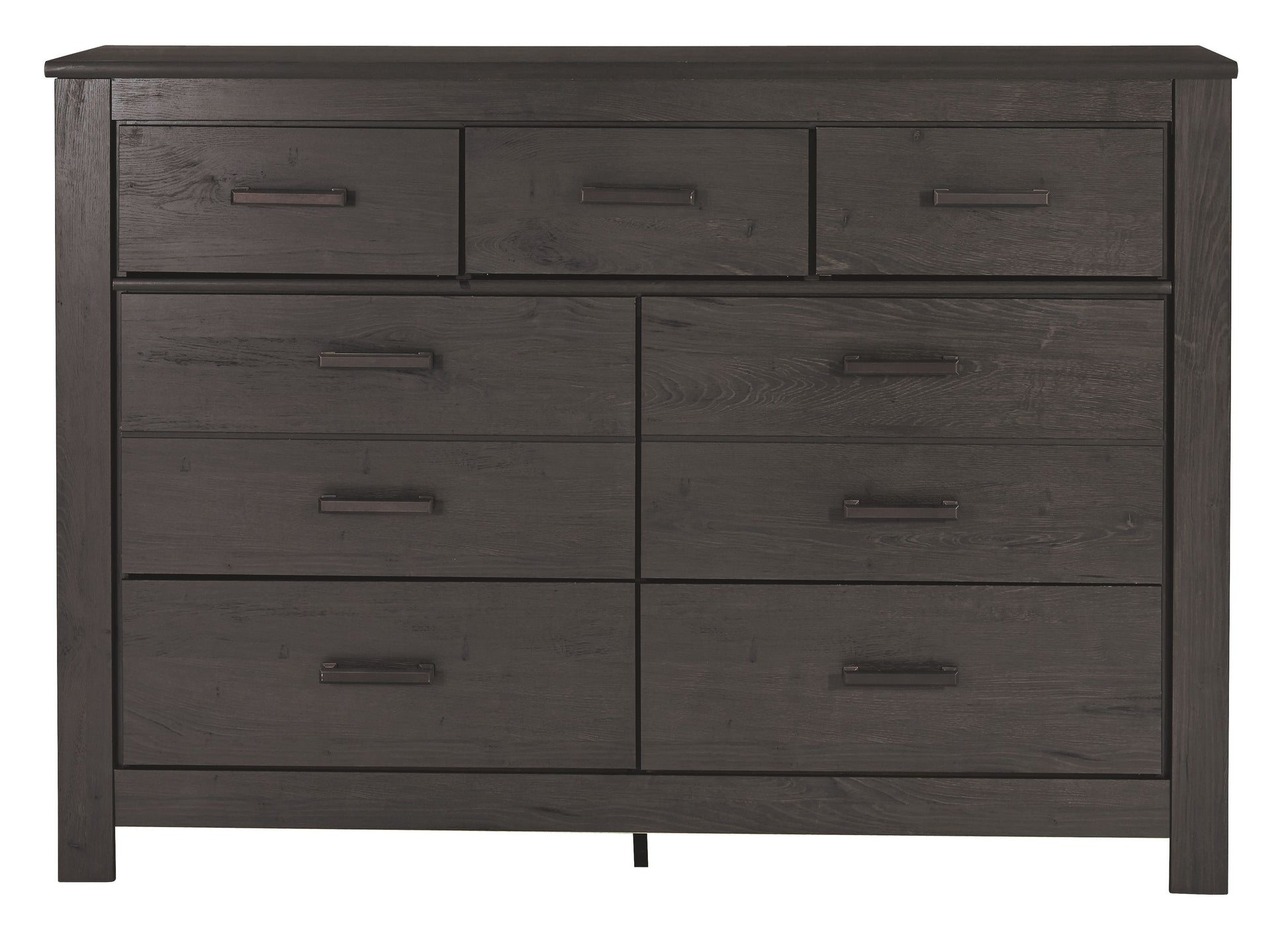 Dark charcoal finish over replicated oak grain. Tall generously scaled cases with wide pilaster. Large dark color handles with an aged appearance accent cases. Modern styled deep panel bed enhanced with horizontal pocket details. Side roller glides for smooth operating drawers. Queen (67) and king/cal king (68) headboards can attach to a bolt-on metal bed frame B100-31 or B100-66 respectively. Queen (67) panel headboard is capable of attaching a full sized metal bolt on bed frame. Safety is a top priority, clothing storage units are designed to meet the most current standard for stability, ASTM F 2057 (ASTM International). Drawers extend out to accommodate maximum access to drawer interior while maintaining safety.