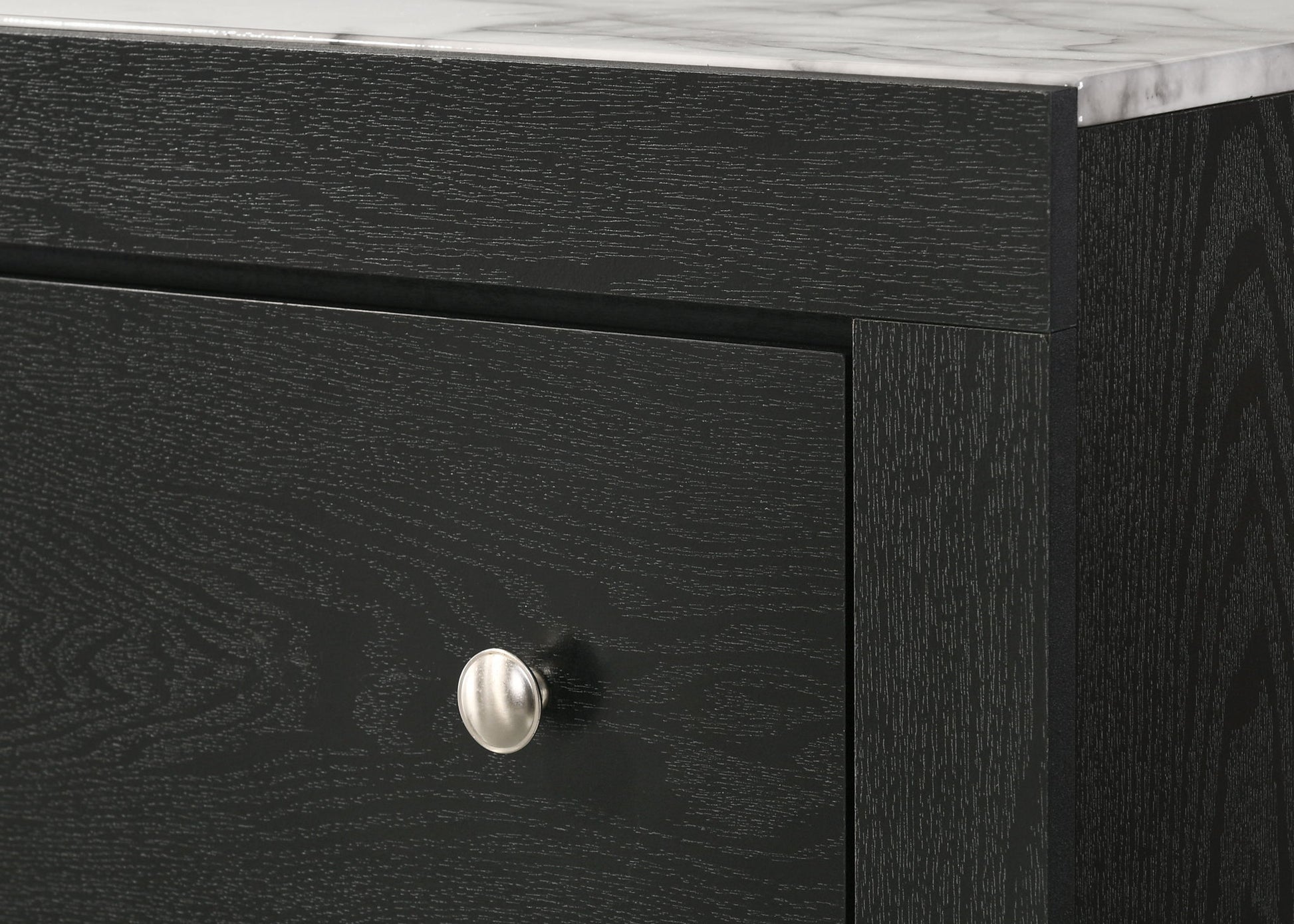 This elegant bedroom collection exudes sophistication with its sleek, dark finish and modern design. The sturdy construction of each piece showcases a rich, textured wood grain, offering both durability and style. The bed, the centerpiece, features a bold, high headboard with built-in shelving and decorative back panels, enhanced by soft illumination for a cozy ambiance. Faux marble tops and sleek knobs accent the case pieces. The harmonious blend of straight lines and minimalistic design ensures this collection will anchor a bedroom with a contemporary yet timeless appeal.