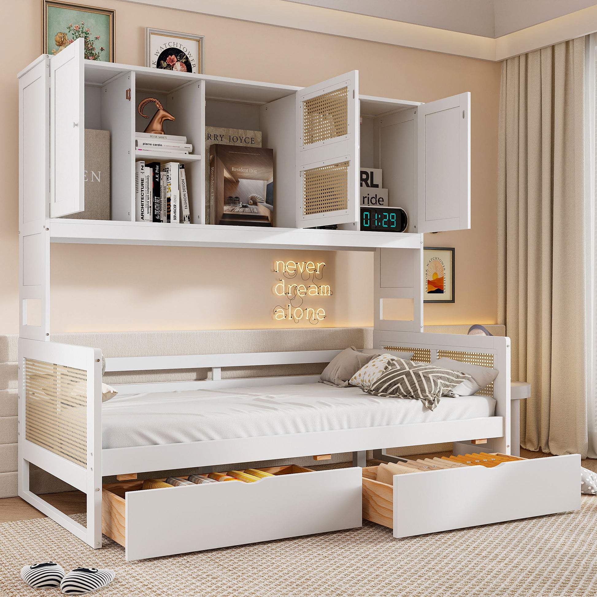 Maximized Space: The daybed occupies minimal space while accommodating two people. The roll-out trundle underneath can be easily slid in and out, making it ideal for spontaneous sleepover guests. Additionally, the shelves and cabinets at the back of the bed provide ample storage for your belongings.