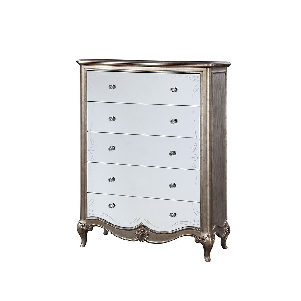 - Elegant Design: This Antique Champagne chest combines luxury and sophistication, featuring five beautifully designed drawers that merge style and practicality.