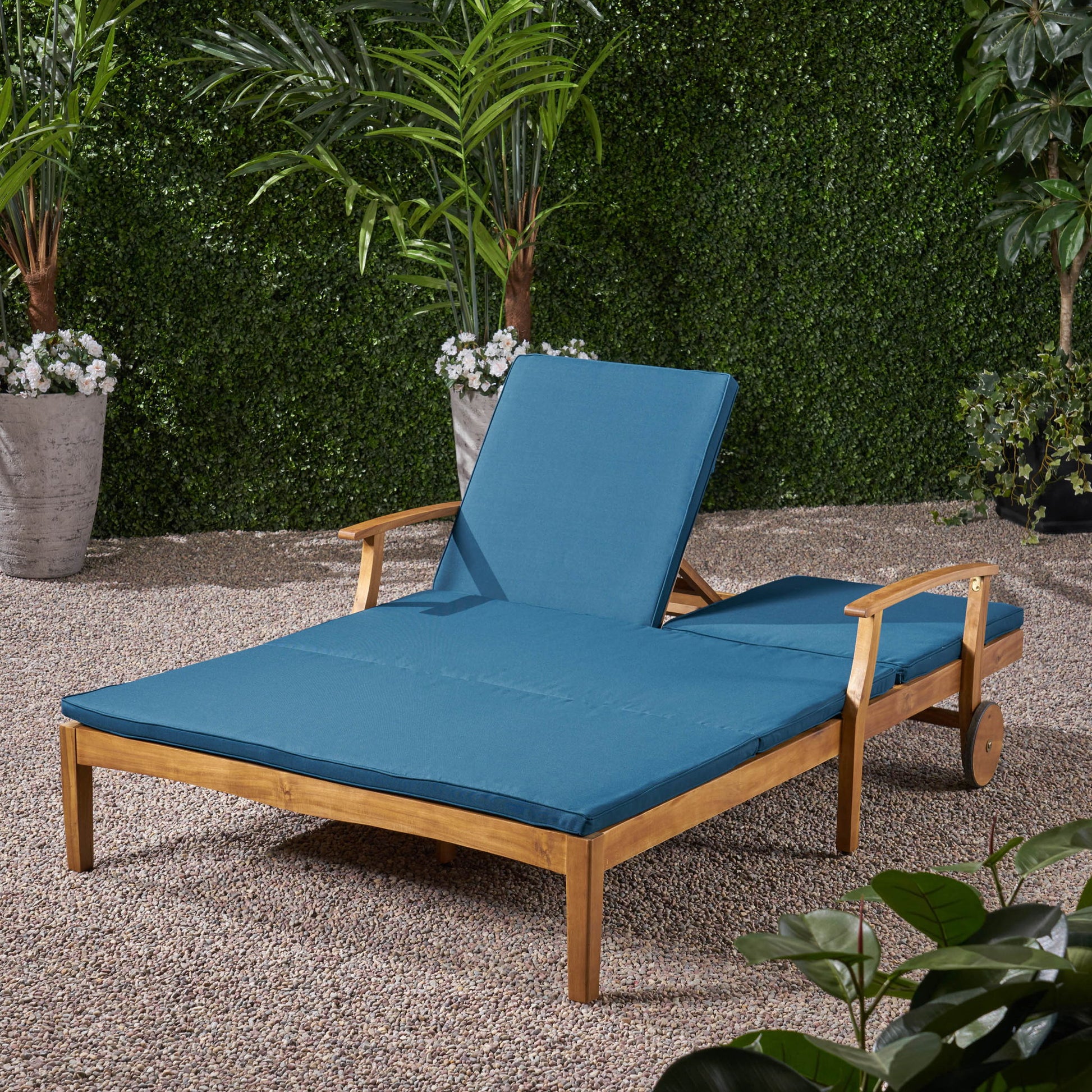Etherealize - Outdoor Adjustable Double Chaise Lounge With Water Resistant Cushions - Teak / Blue