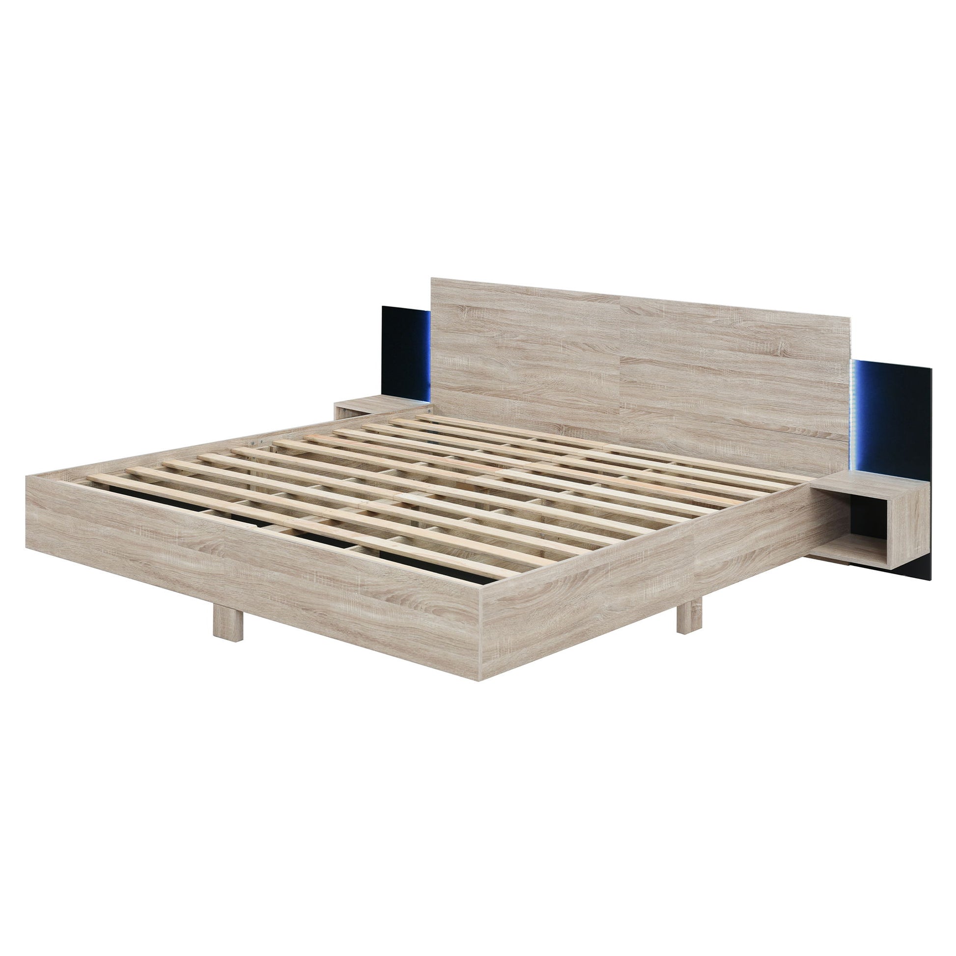 Queen Size Floating Platform Bed, With LED Lights, Bedside Nightstand - Natural
