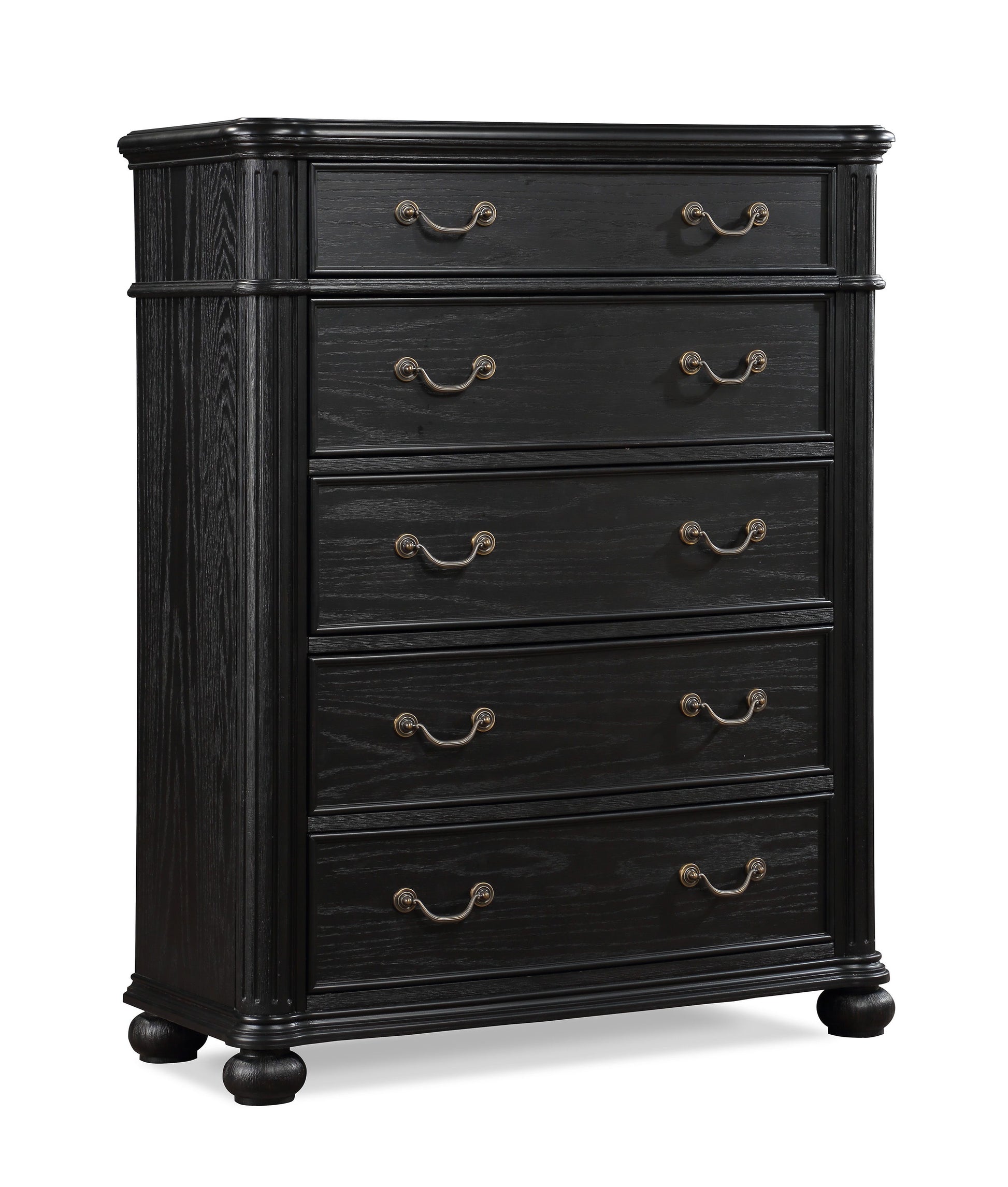 Indulge in the timeless elegance of this exquisite bedroom collection, a true embodiment of classic sophistication. Each piece is masterfully constructed with a striking charcoal finish that commands attention while accentuating the intricate detailing and flowing lines. The magnificent bed, with its bold headboard, has an optional pediment and is upholstered to create a stunning contrast that promises opulent comfort. Complementing the bed are the sleek nightstands and capacious dresser, each graced with antique finish hardware against the matte background.