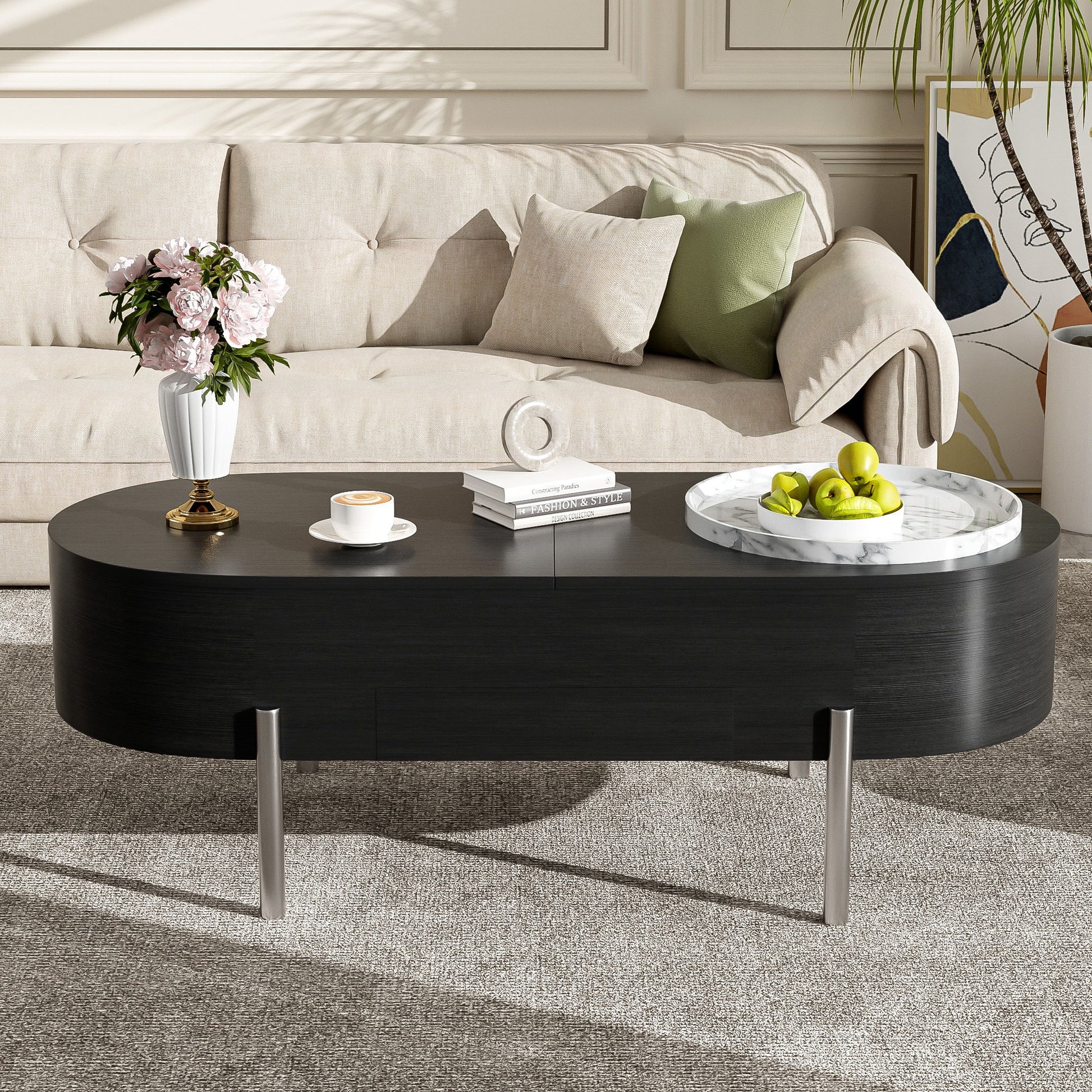 Lift Top Coffee Table With 360 Degree Marble Patterned Rotating Tray, Hidden Compartment, Partially Assembled Wooden Center Table, Modern Oval Lift Tabletop For Home Living Room - Black