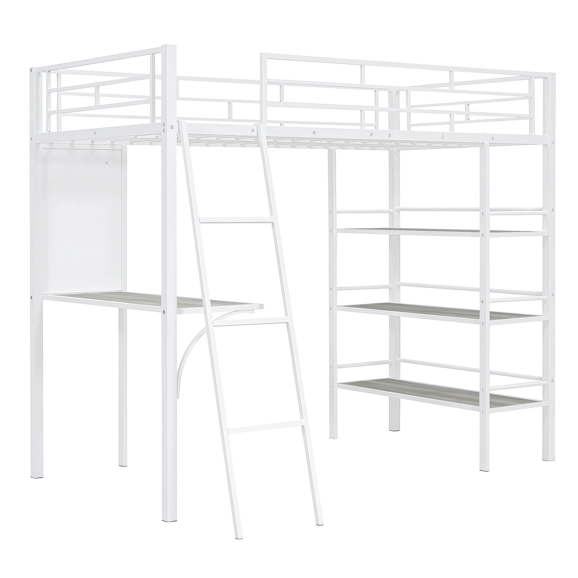 Crafted of metal in a clean painted finish, this metal loft bed strikes a clean-lined silhouette with slatted guardrails. The 3-layer open shelves offer ample space to display whatever you want. Equipped with a large desk and board underneath, this bed provides a comfortable place to work, read, and enjoy yourself. This loft bed will be a beautiful and practical piece in your bedroom.