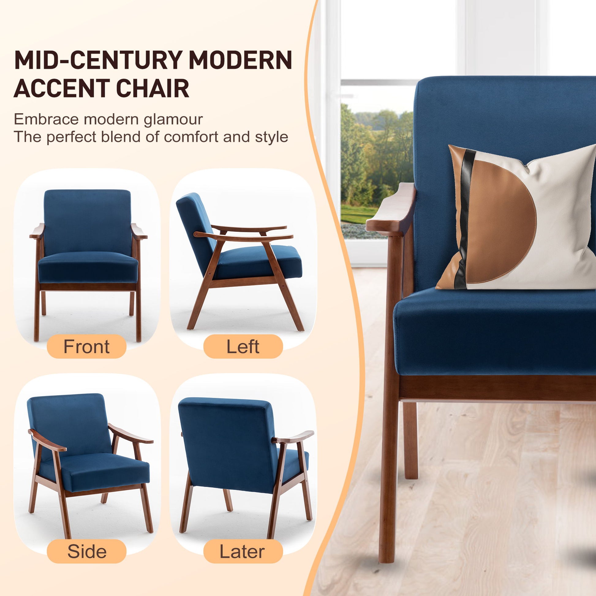 - Mid-Century Modern Design: Stylish curved arms and wooden legs showcase the charm of mid-century modern aesthetics; natural wood frame and pastel colors bring relaxation and tranquility to any room.