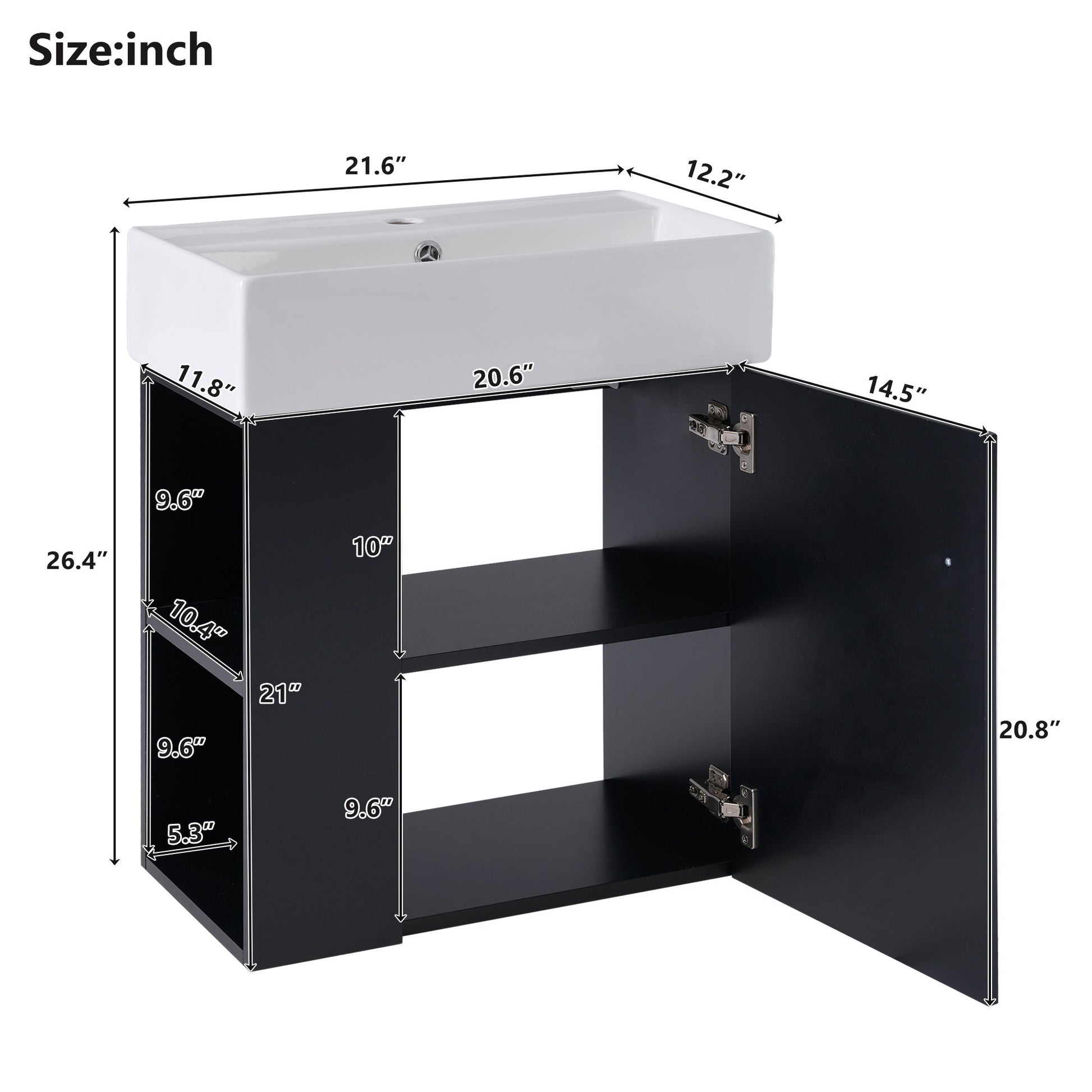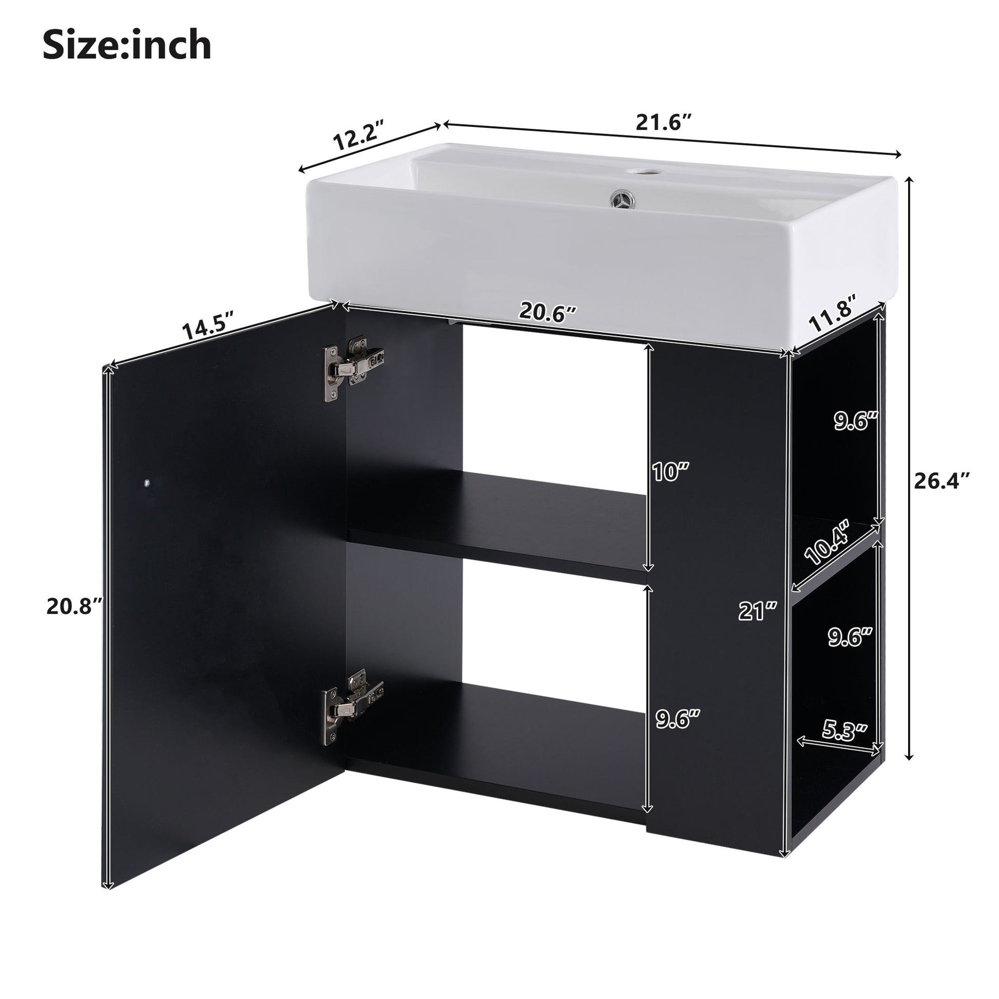 Modern Floating Bathroom Vanity With Ceramic Basin, Perfect For Small Bathrooms, Left Side Storage - Black