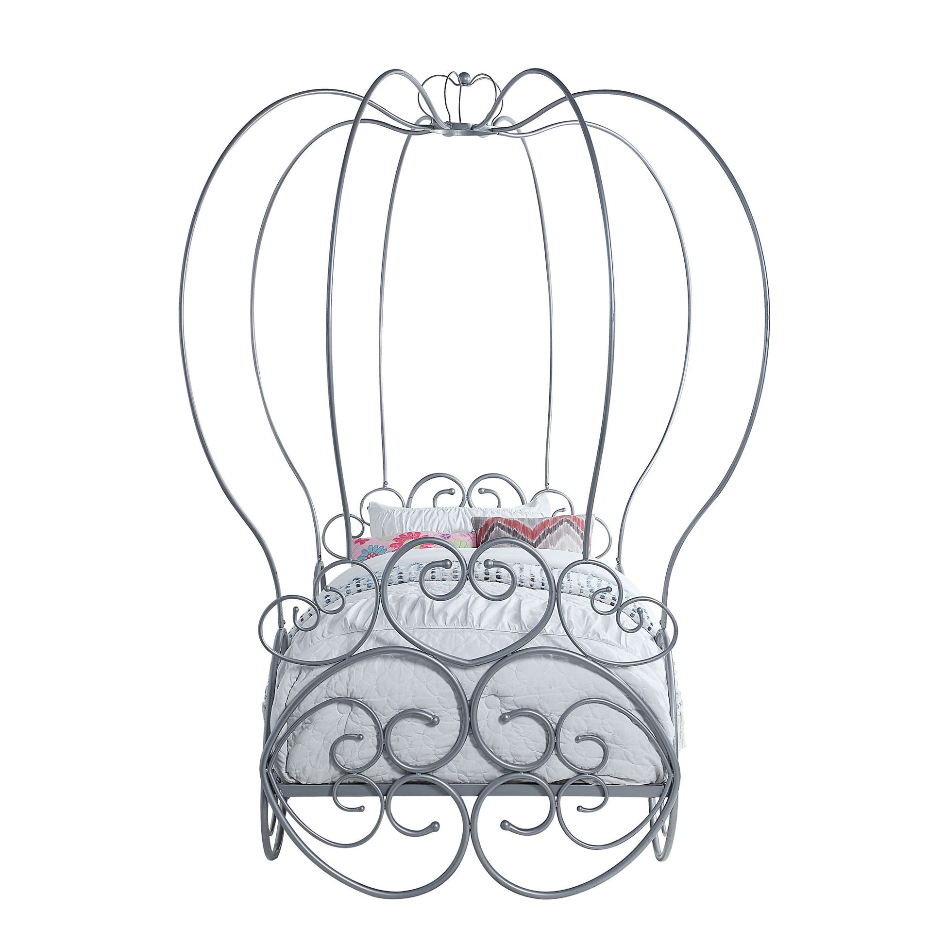 - Whimsical Design: This Twin Metal Bed with canopy offers a playful and charming look, making it ideal for children's rooms or guest spaces. Its pumpkin design and scrolled side rails add a unique and delightful character to any room.