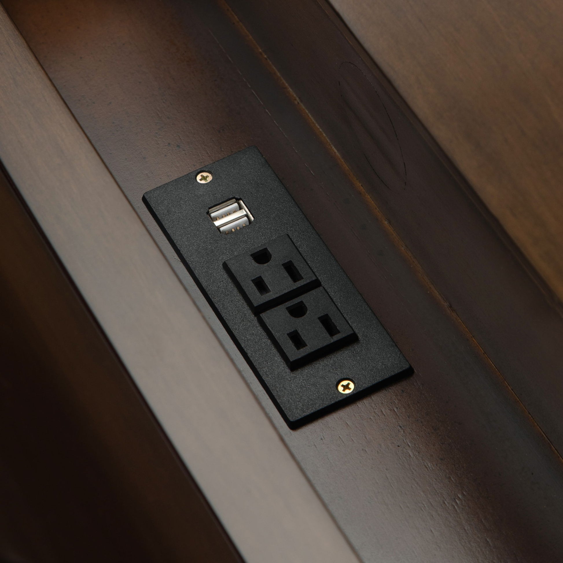 - Features three large drawers with metal glides, two lift top compartments with storage and cord management featuring 2 outlets with 2 USB ports